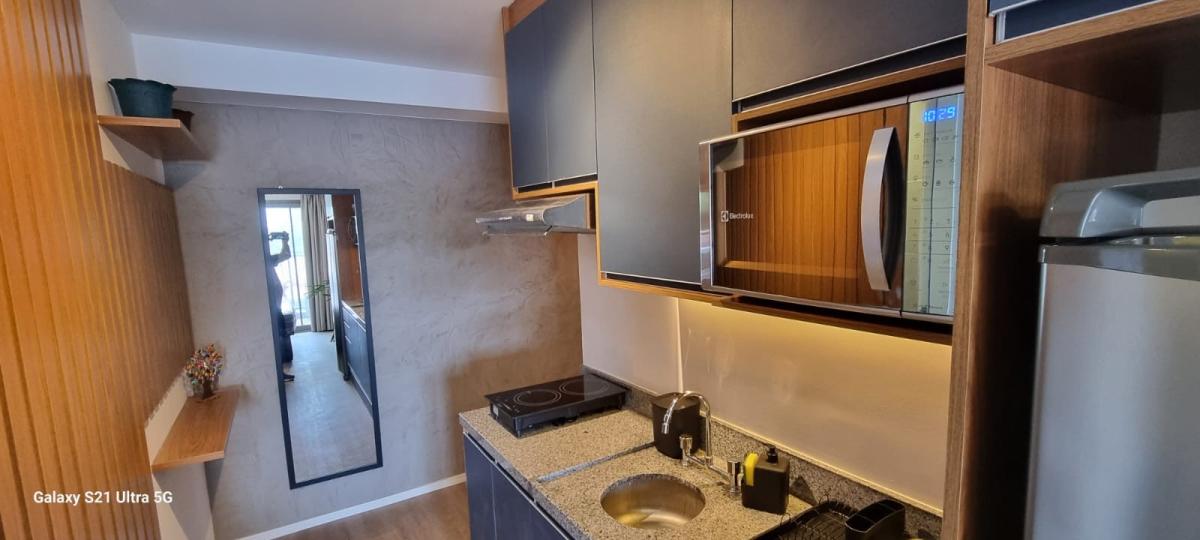 - Cozinha equipada com geladeira, cooktop e micro-ondas